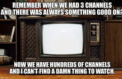 Those of us that were children of the 50s, 60s and 70s got up from the chair, stood in front of the boxed in screen, turning the dials to the 5 or 6 television stations that existed.