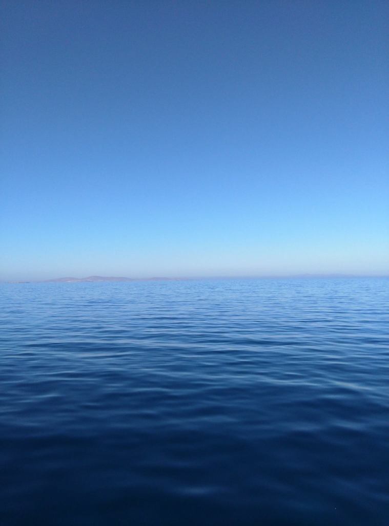 Blue sky and ocean surround us.