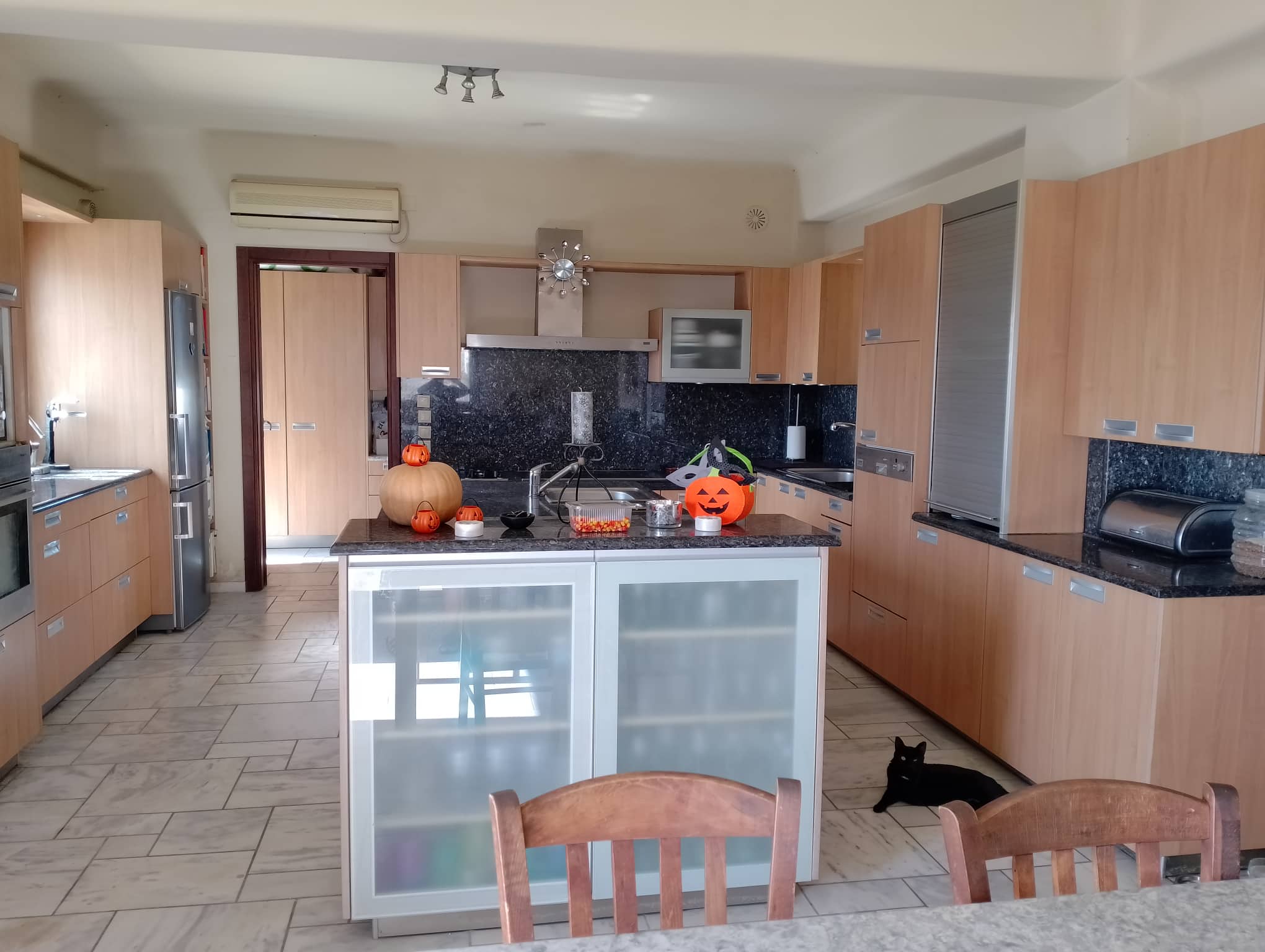 My kitchen decked out, complete with black cat.